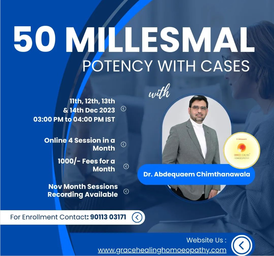 During the 4 sessions with Dr. Abdequaem Chimthanawala at his GraceHealing Homoeopathy clinic from December 11th to December 14th, 2023, the topic of discussion will revolve around the application of 50 millesmal potency in various cases.